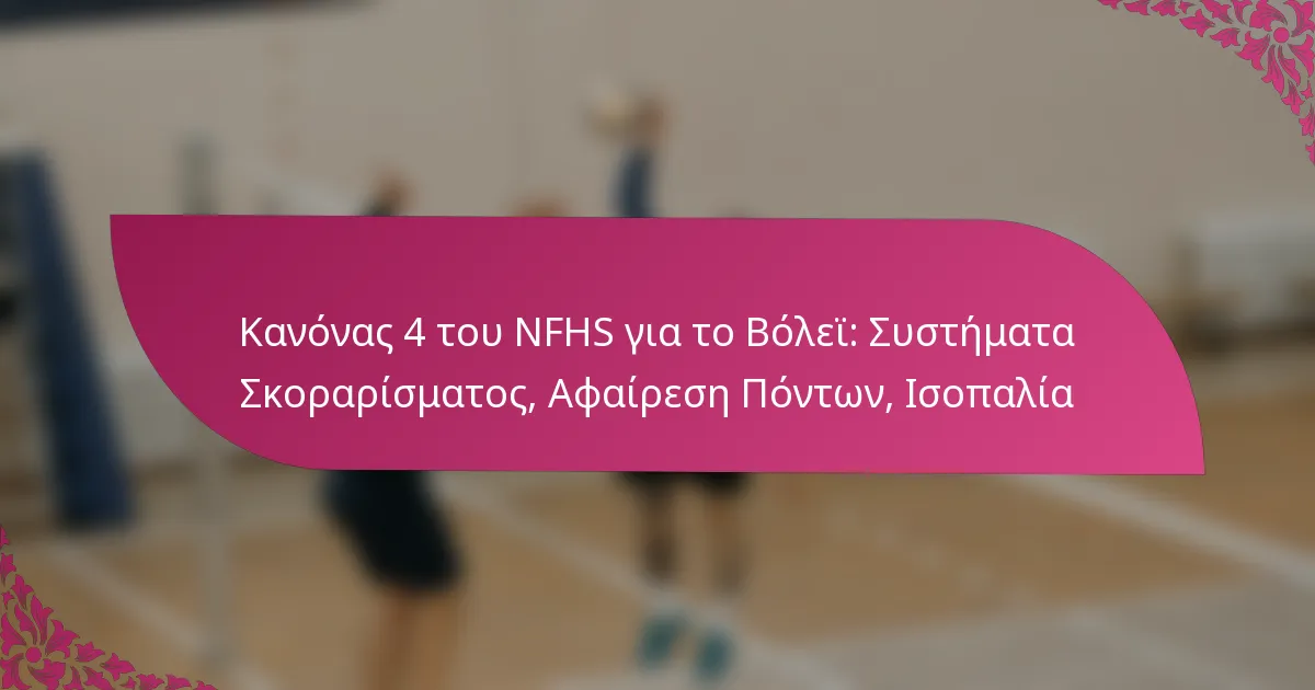 Ο Κανόνας 4 του NFHS για το βόλεϊ περιγράφει τα συστήματα βαθμολόγησης που χρησιμοποιούνται στο βόλεϊ των λυκείων, εστιάζοντας κυρίως στη βαθμολόγηση rally και στις παραδοσιακές μεθόδους. Η κατανόηση αυτών των συστημάτων είναι κρίσιμη για τους παίκτες, τους προπονητές και τους διαιτητές, καθώς επηρεάζουν άμεσα τα αποτελέσματα των αγώνων και τις στρατηγικές.